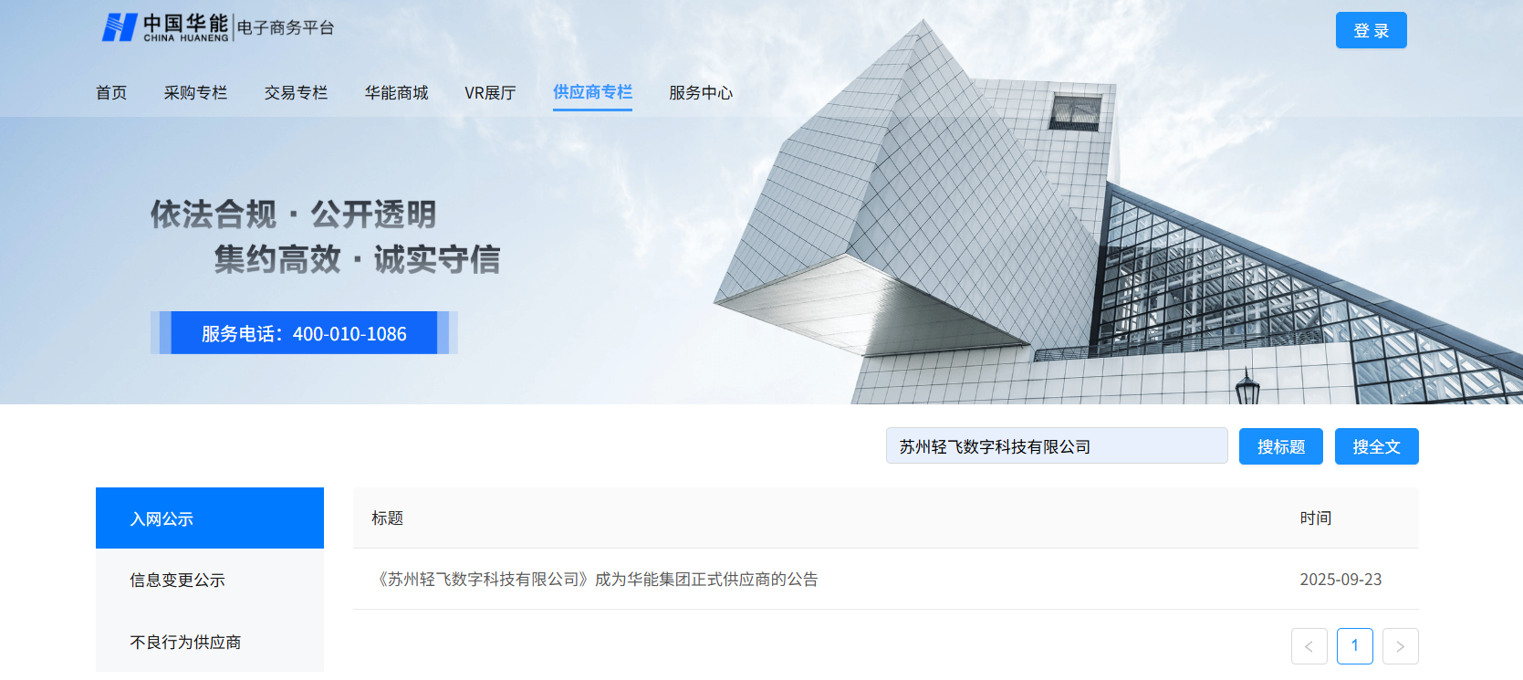 《苏州轻飞数字科技有限公司》成为华能集团正式供应商的公告:https://ec.chng.com.cn/channel/home/#/detail?id=12810876
